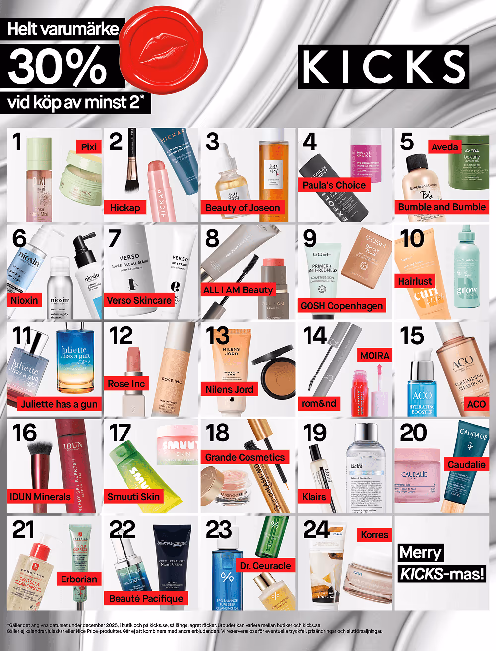 Står det beauty på önskelistan? Hos KICKS hittar du mängder av julklappar att ge bort, eller behålla själv. I vår julkalender öppnar vi TVÅ beauty deals varje dag fram till julafton. Få upp till 50% på en bästsäljande produkt och 30% på ett helt varumärke vid köp av två. December är din chans att shoppa beautyfavoriter till riktigt bra priser. Skynda dig till din kicks-butik eller klicka in dig på kicks.se – erbjudandena gäller så långt lagret räcker.